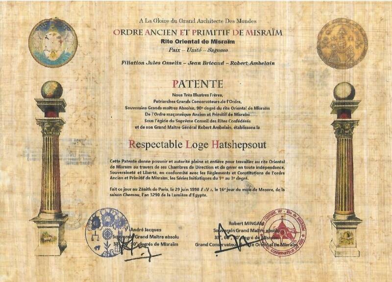 A la différence de la patente qui nous fut délivrée par la GLISRU, qui atteste de notre soumission administrative à cette obédience, celle de Misraïm rappelle notre engagement à perpétuer ce rite séculaire en toute indépendance, dans le respect de ses règles établies par ses Grandes Constitutions.
